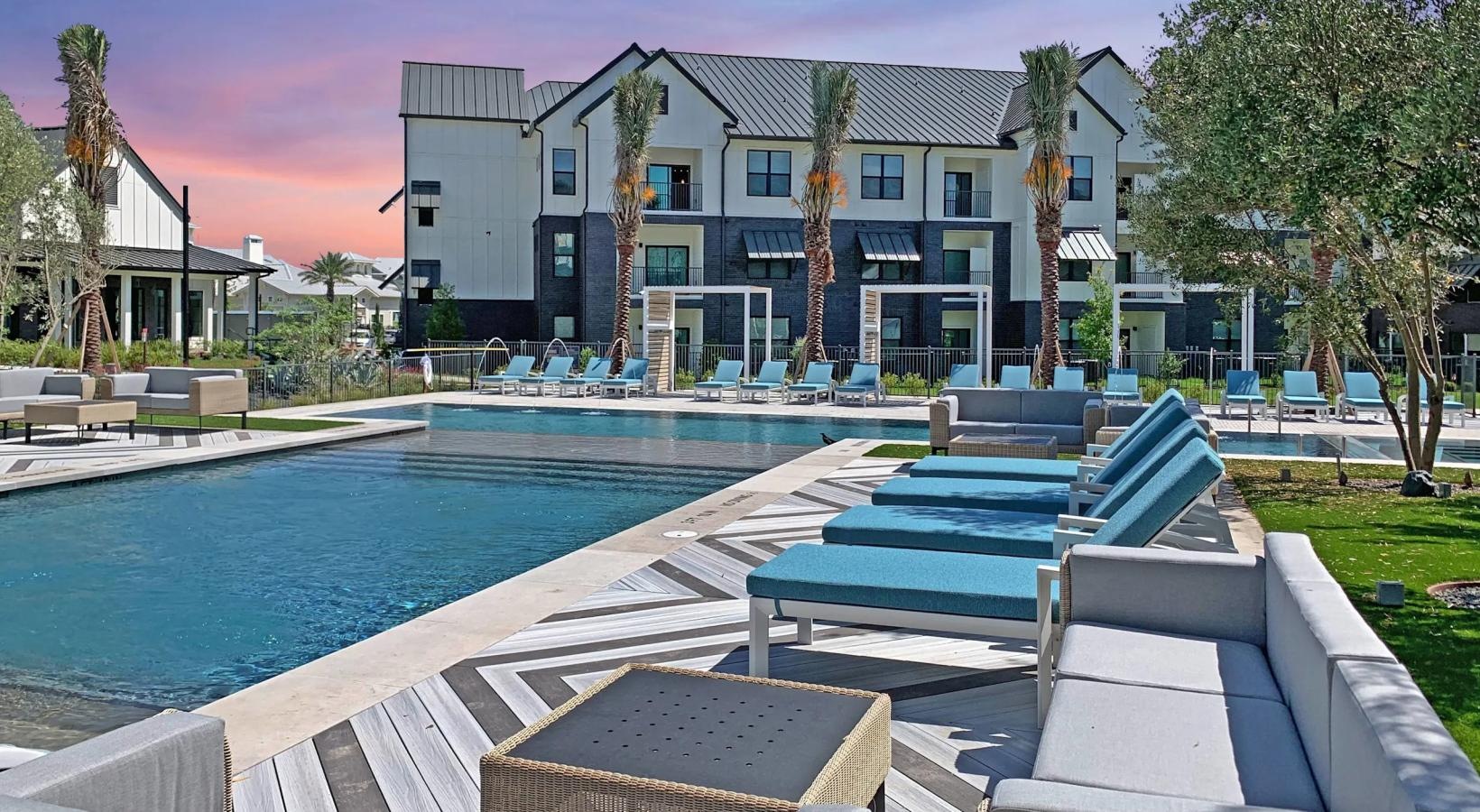 • a pool with lounge chairs around it