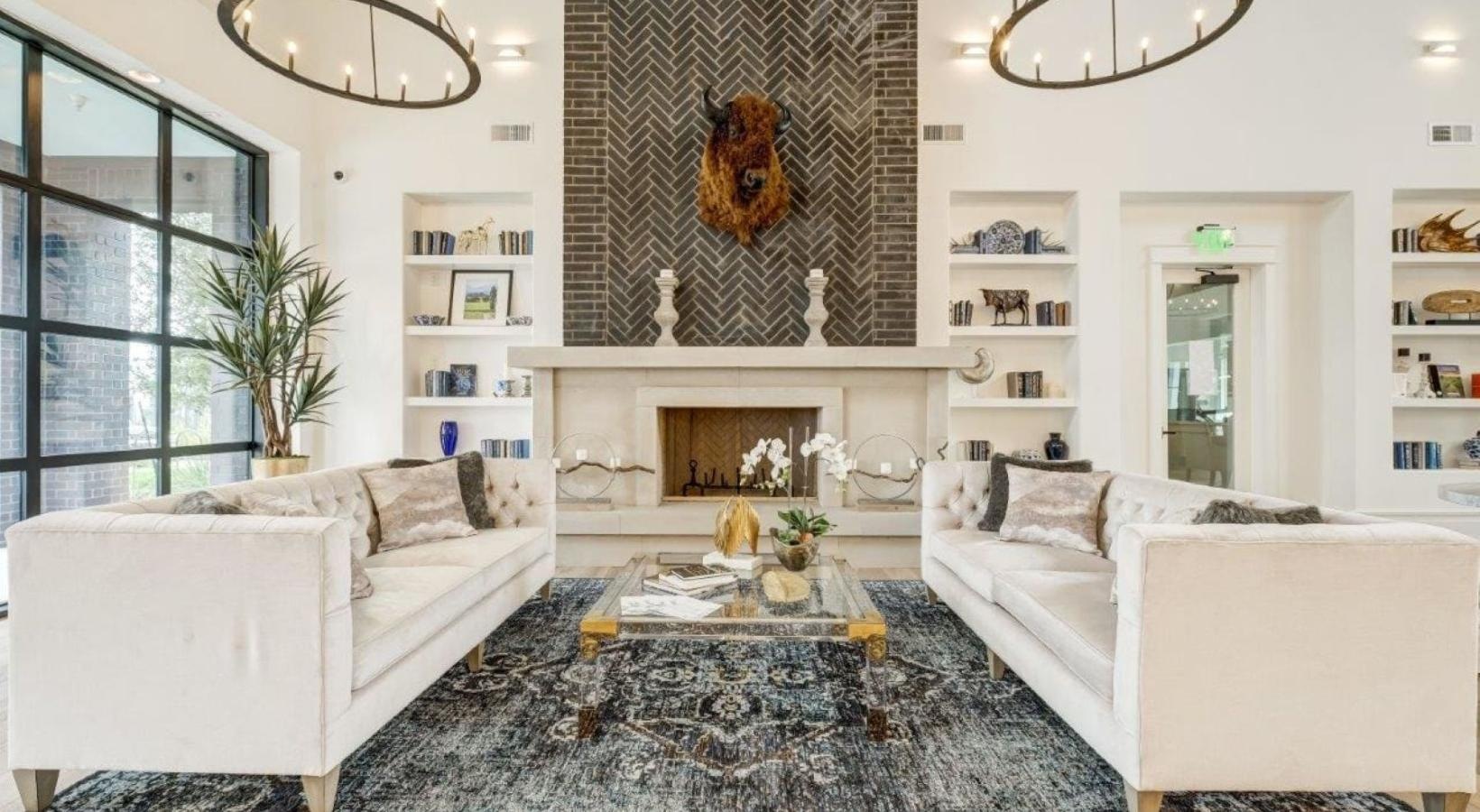 a clubhouse room with a fireplace