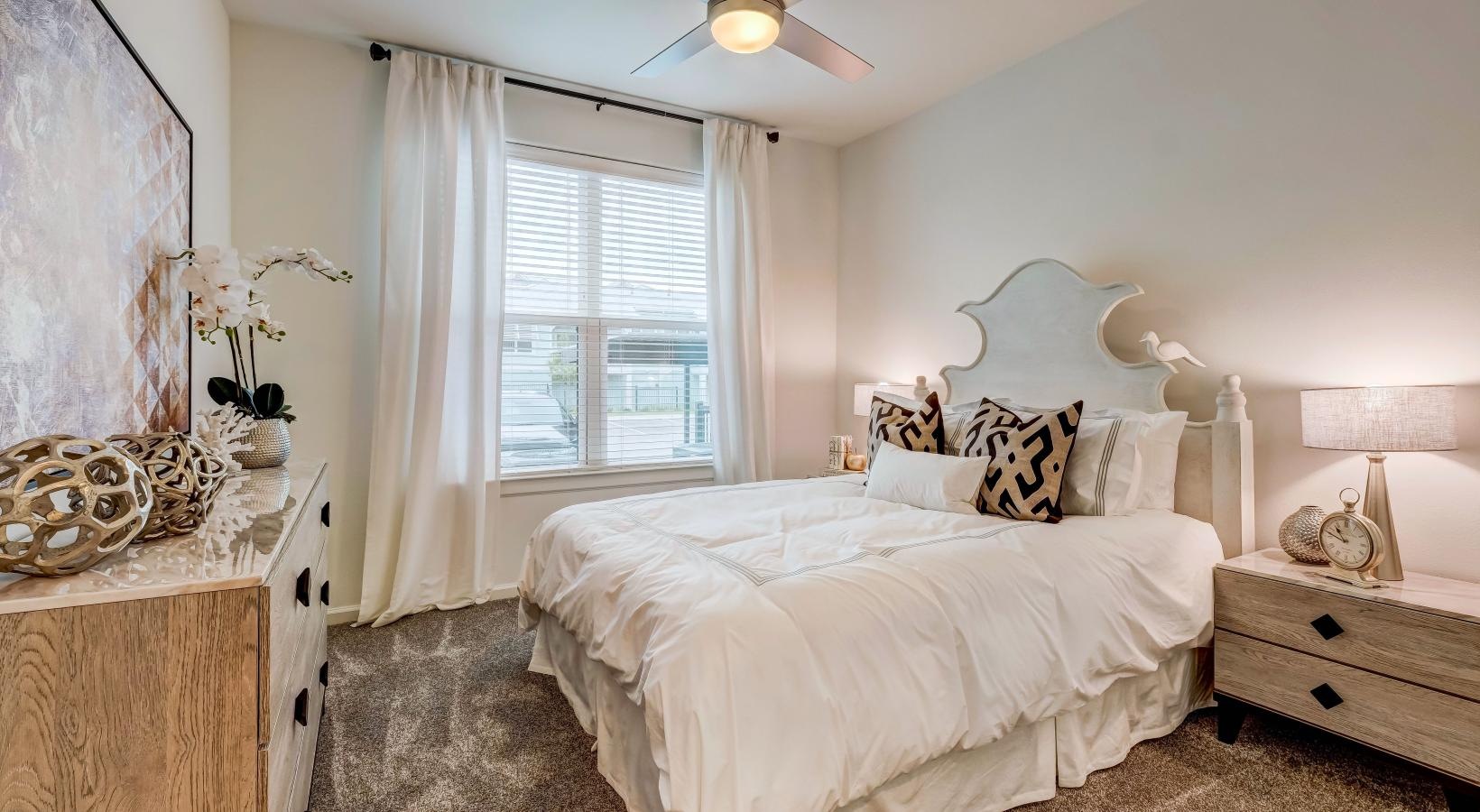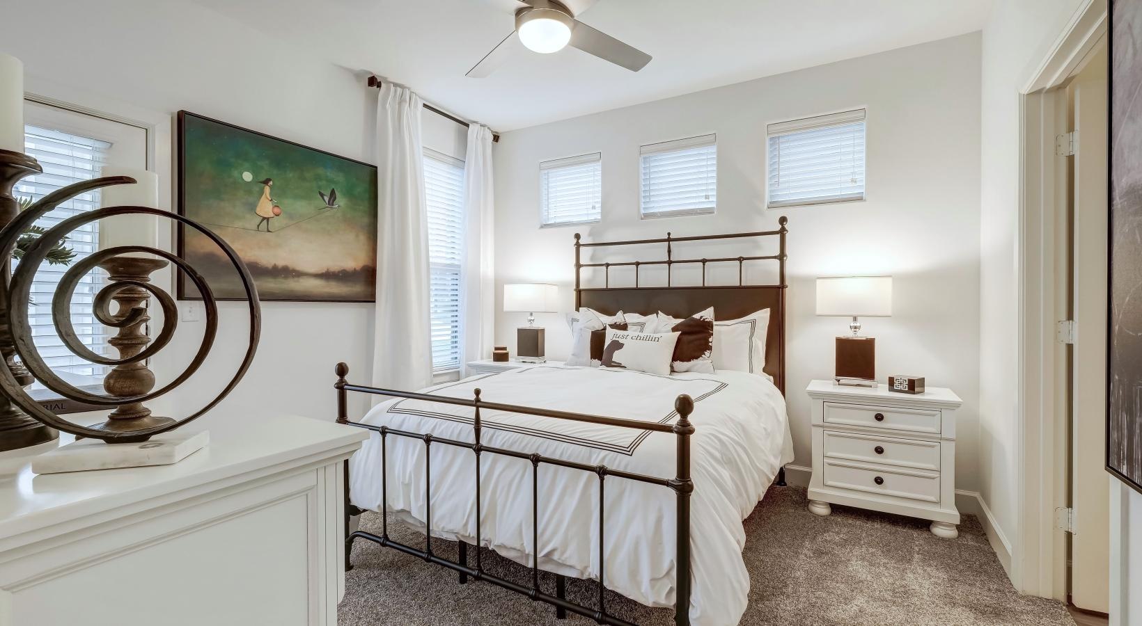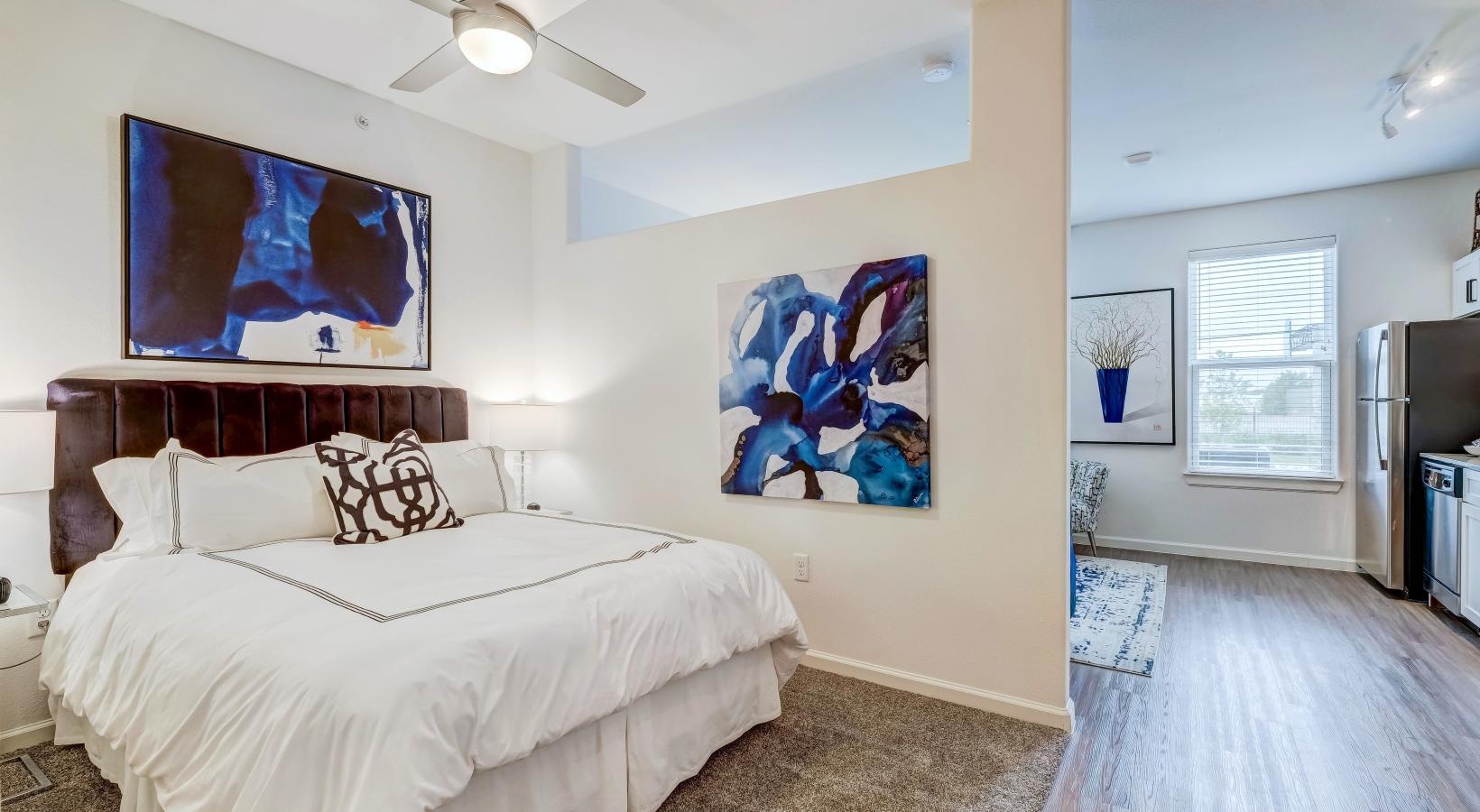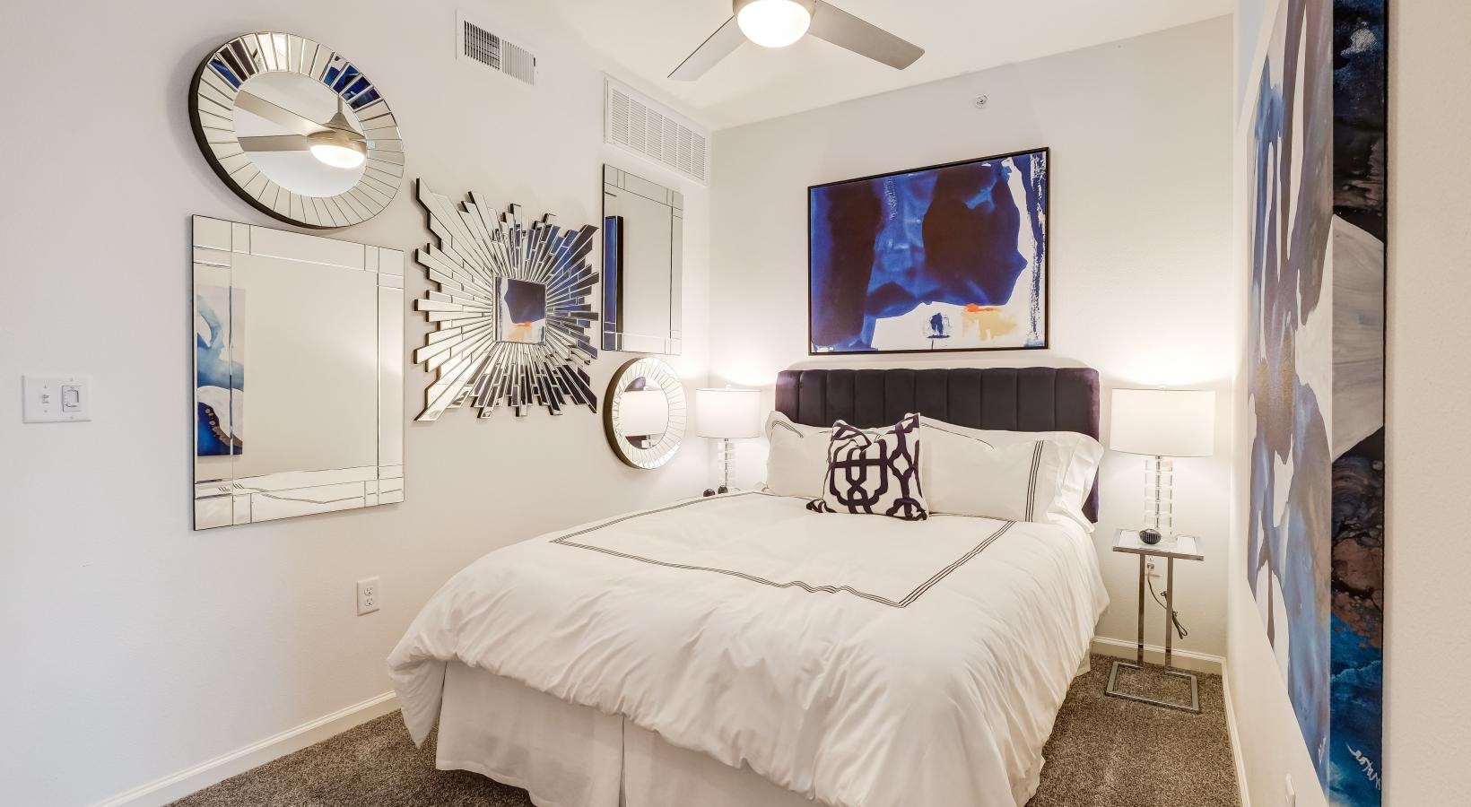 • a bedroom with a bed and a fan