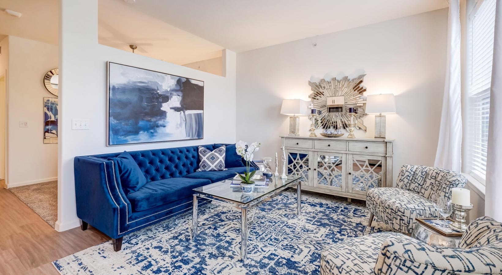 • a clubhouse room with a blue couch