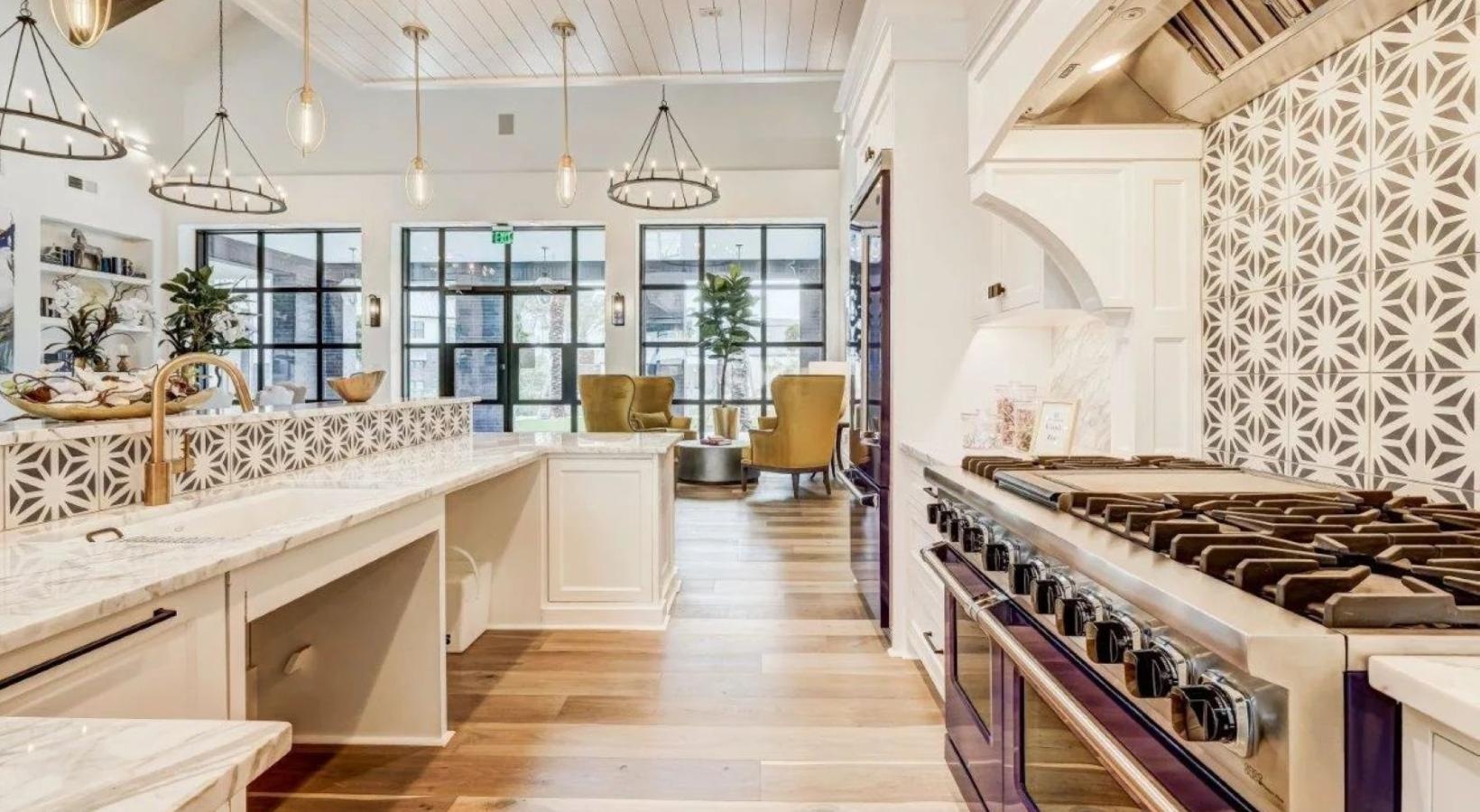 • a clubhouse kitchen with a large counter and wood floors